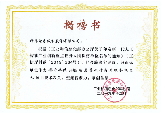 近日,工業(yè)和信息化部辦公廳印發(fā)“新一代人工智能產(chǎn)業(yè)創(chuàng)新重點(diǎn)任務(wù)入圍揭榜單位名單”,山東省共8家企業(yè)入圍重點(diǎn)任務(wù)榜單,神思電子獲批潛力單位,開展智慧營(yíng)業(yè)廳商用服務(wù)機(jī)器人項(xiàng)目技術(shù)攻關(guān)。